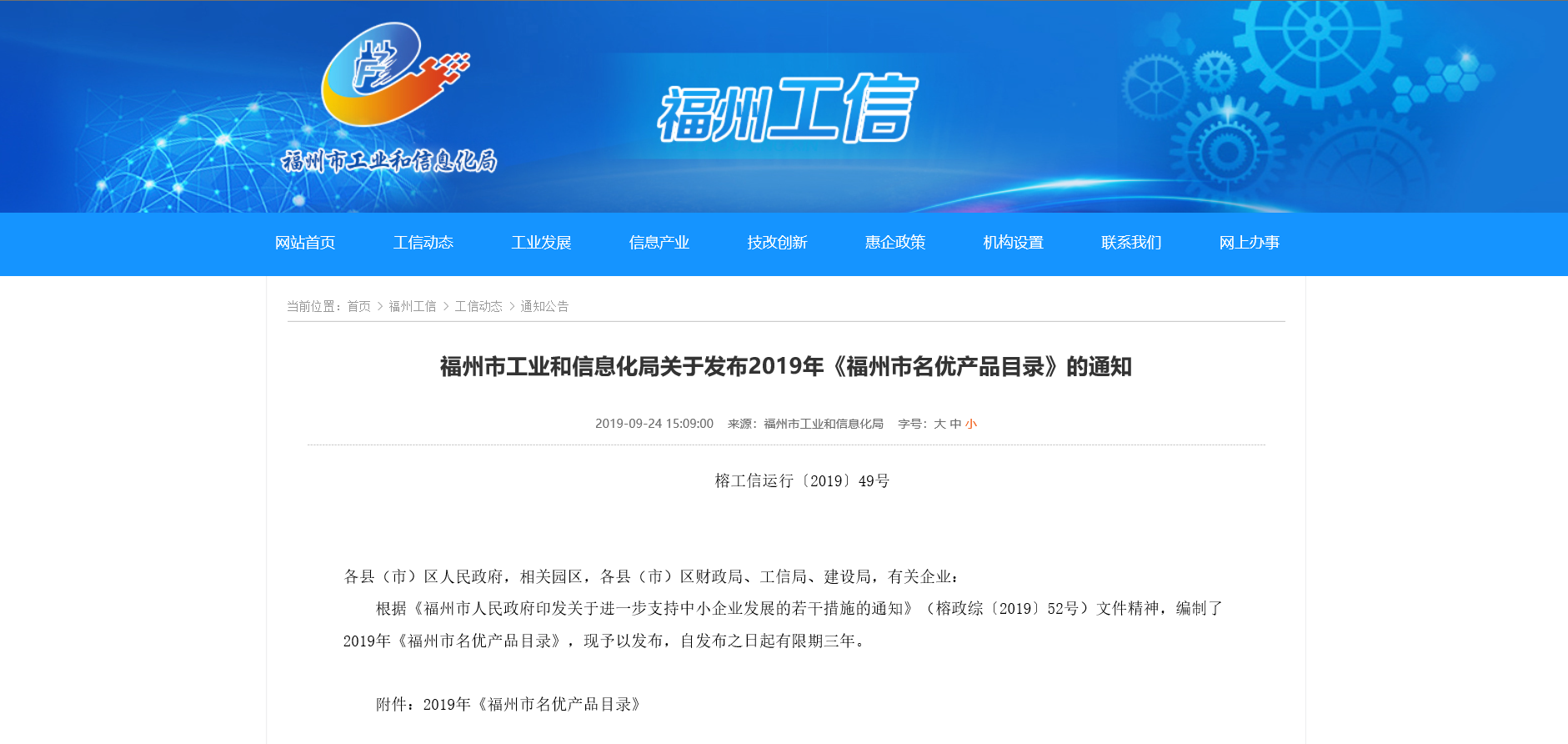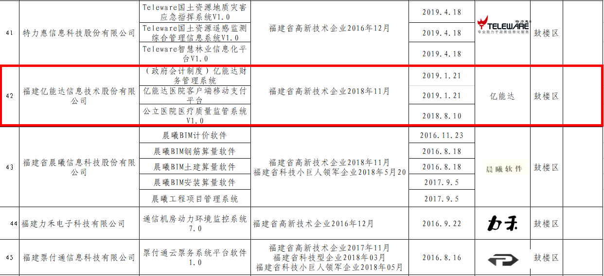 2019年9月23日,福州市工业和信息化局发布了2019年《福州市名优产品目录》,本次软件类共有12家企业的产品上榜名优产品目录,其中我司自主研发的《(政府会计制度)亿能达财务管理系统》、《亿能达医院客户端移动支付平台》及《公立医院医疗质量监管系统V1.0》成功入选。